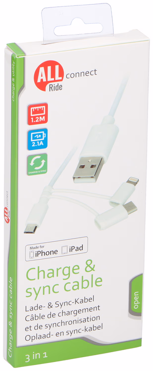 Gallery showing 4 images of ALL RIDE multi Töltő és adatkábel Lightning / C-type / Micro usb, 2,1A, 1,2m