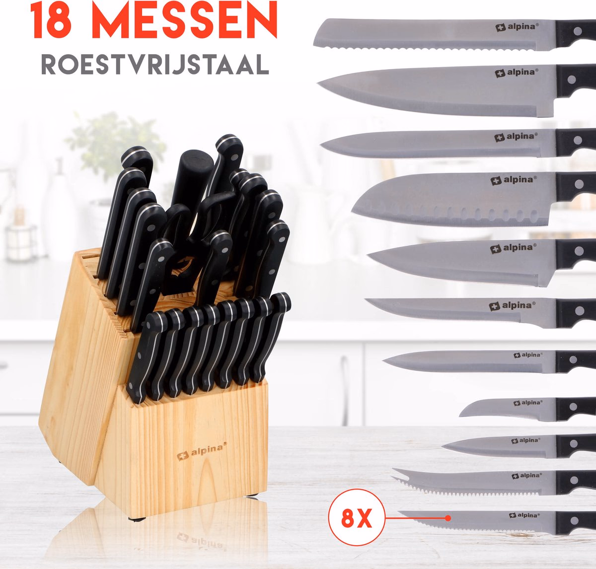 A készlet 18 db kést és 3 egyéb konyhai kiegészítőt tartalmaz.