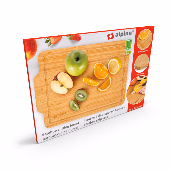 Az Alpina vágódeszka kemény bambuszból készült ezáltal ellenállóbb a kopással és sérülésekkel szemben, így a kés éleit nem tompítja el, valamint antibakteriális hatással is bír.