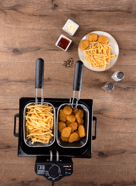 Az olajsütő 3 sütőkosárral, 1 nagyobb és 2 kisebbel rendelkezik, űrtartalma 5 liter, teljesítménye 2000 watt.