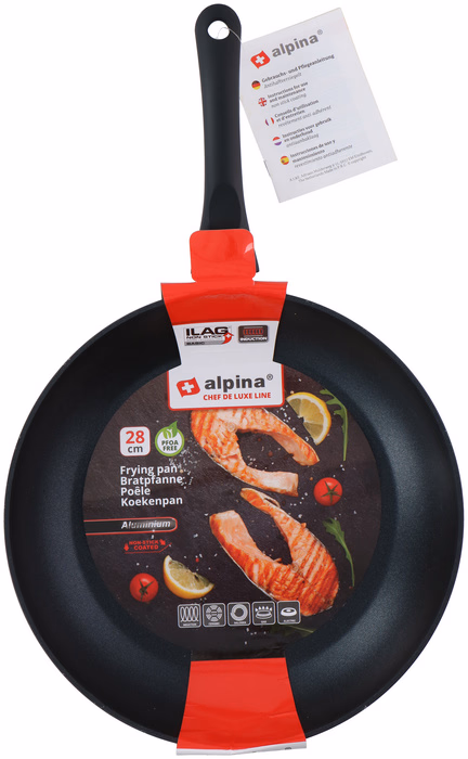 Az Alpina 28cm átmérőjű serpenyője tapadásmentes bevonattal és hőálló fogantyúval van ellátva.