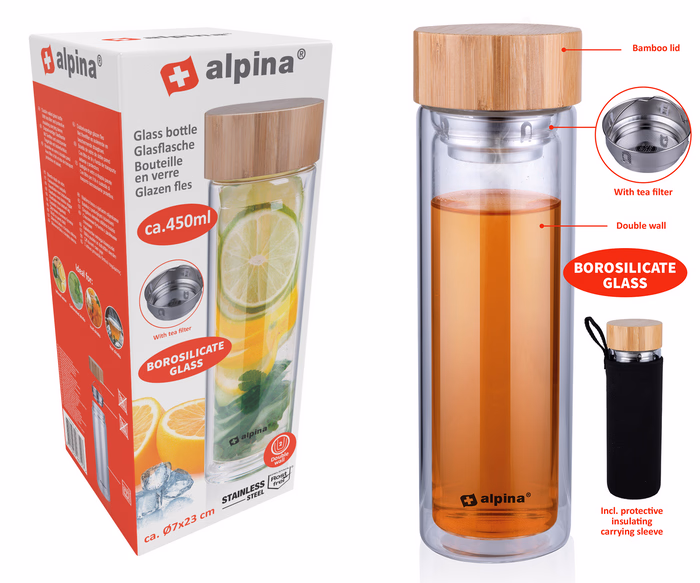 ALPINA Tároló boroszilikát üveg 450ml; Đ7 x23cm bambusz tetővel; teaszűrővel, hordozható, szigetelő tokkal