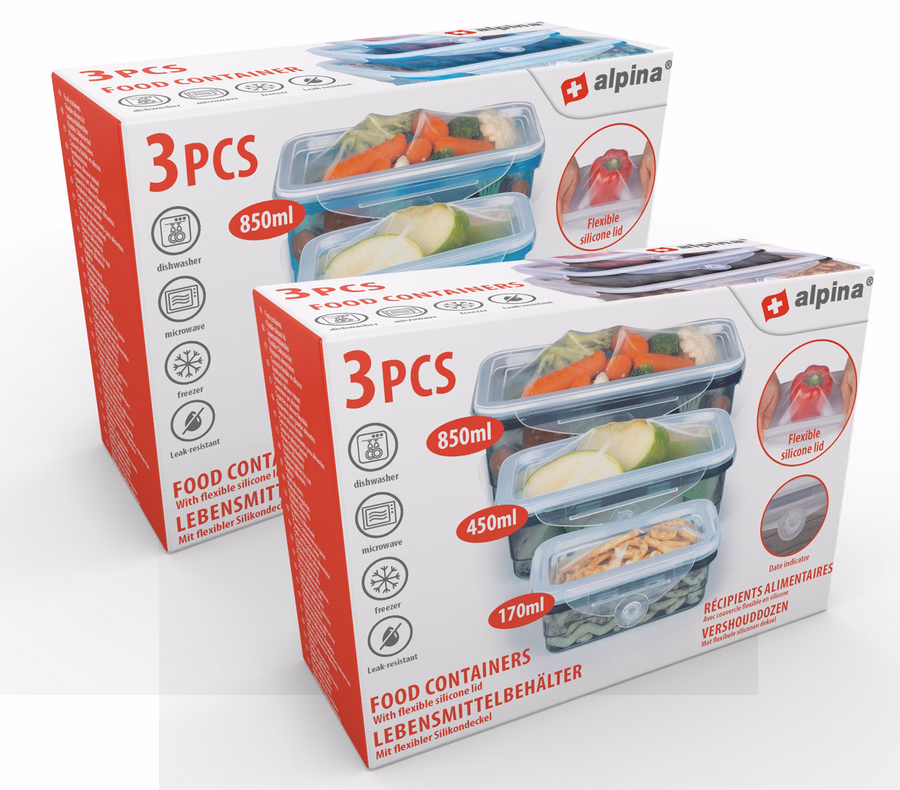 ALPINA Tároló doboz műanyag, flexibilis szilikon tetővel, 3 darabos szett 170ml/450ml/850ml, 2 színben