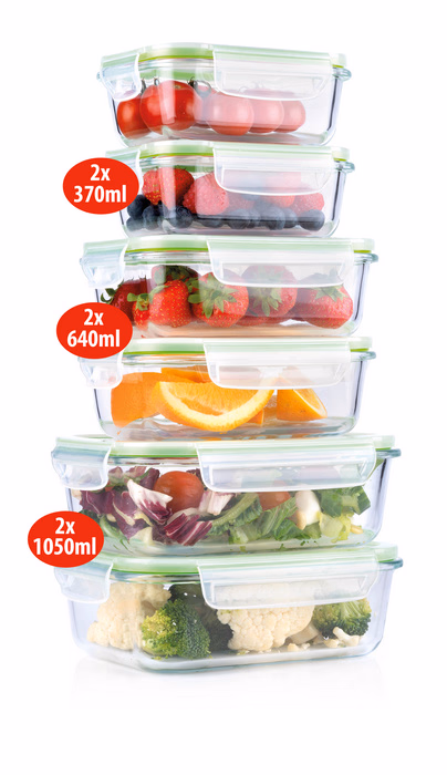 Az Alpina készlet összesen 6 db fedeles tárolóedényt tartalmaz: 2 db 370 ml-es, 2 db 640 ml-es és 2 db 1050 ml-es űrtartalmú.