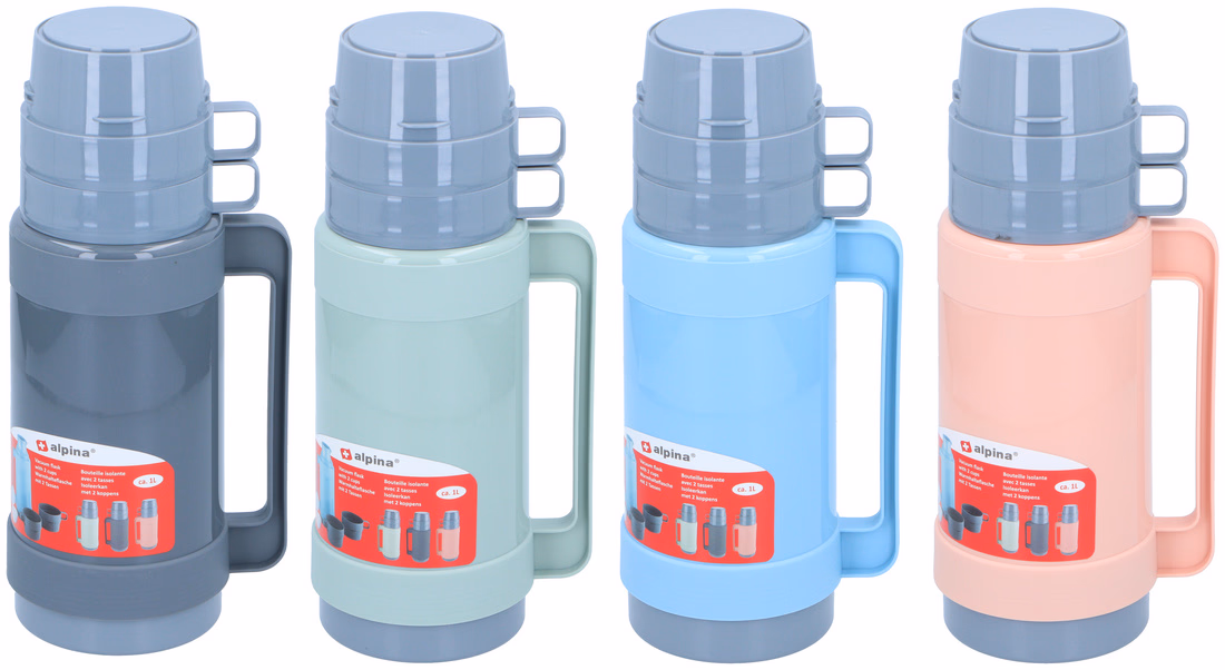 ALPINA Termosz 1L 4 színben 2 pohárral PP/üveg belső