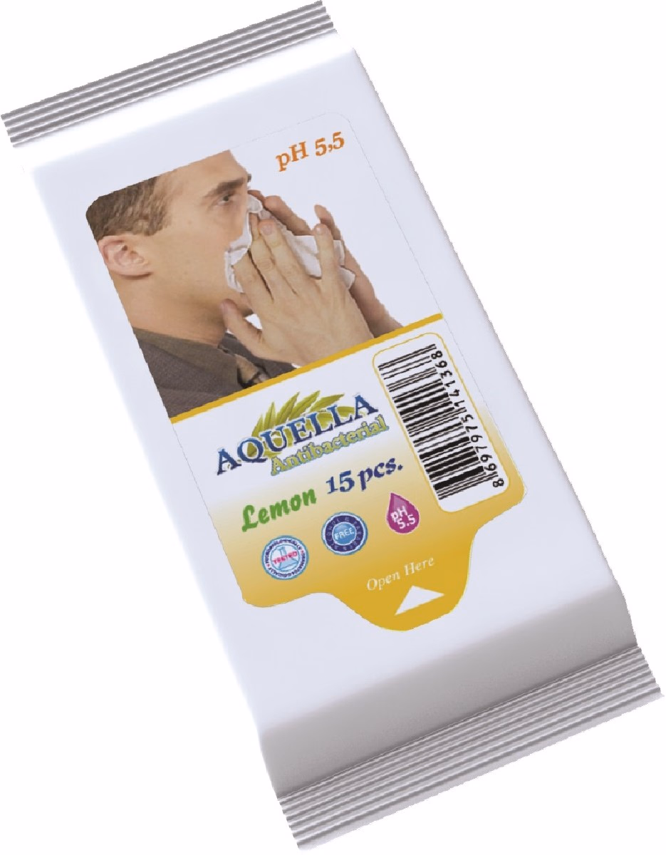 Aquella Antibakteriális hatású nedves törlőkendő Citrom illattal, 15 lapos utazócsomag, 36 csomag