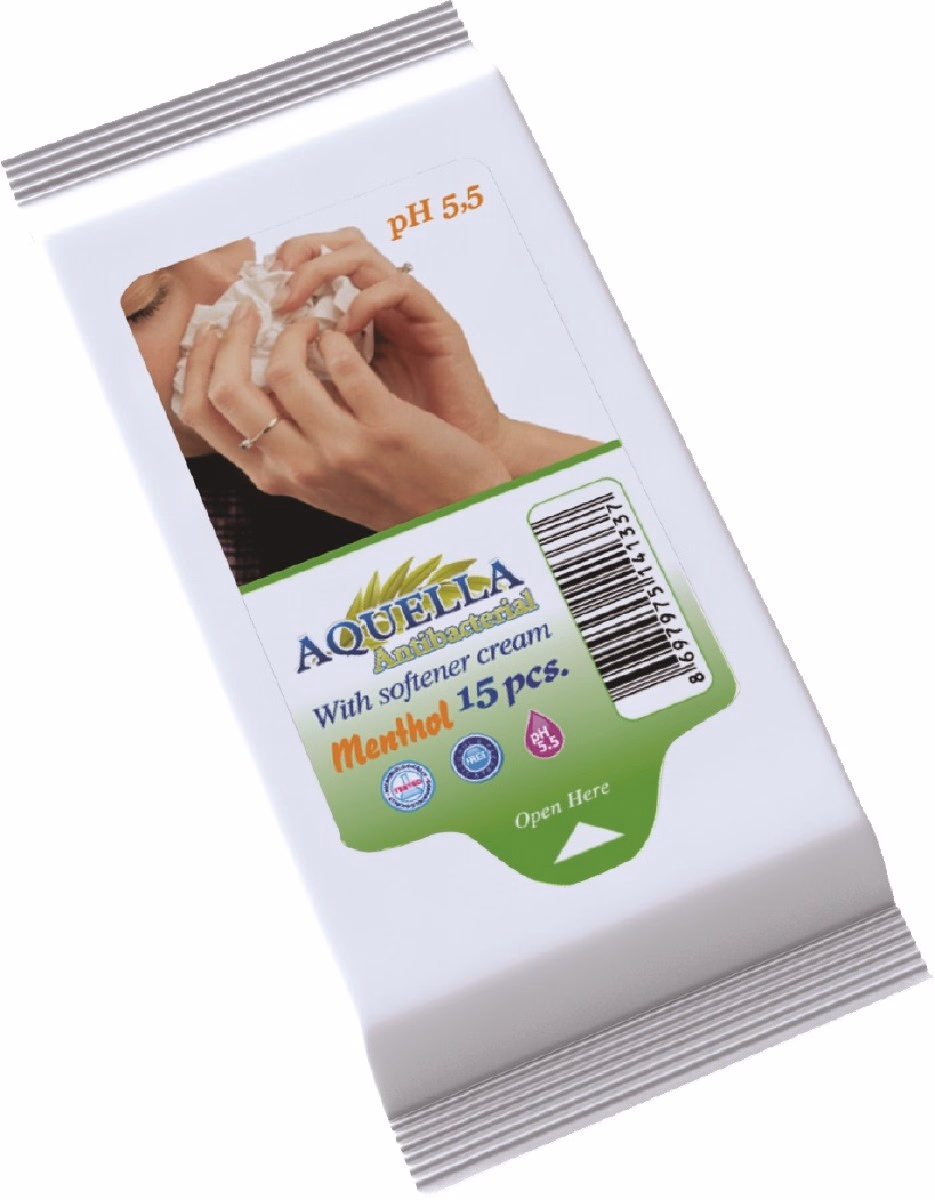 Aquella Antibakteriális hatású nedves törlőkendő Mentolos illattal, 15 lapos utazócsomag, 36 csomag