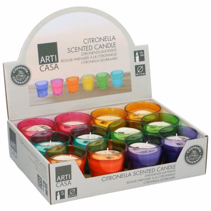 ARTICASA Citronella gyertya üvegben; 12óra égési idő; 75gr wax 7,5X7,5cm; 6 színben, displ(12); -