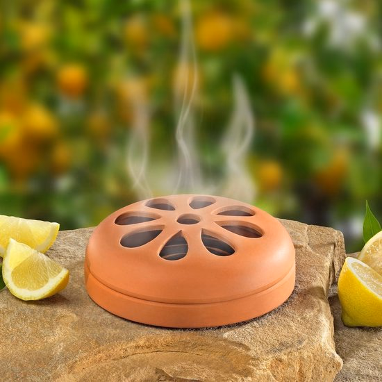 Élvezze a nyári estéket bosszantó szúnyogok nélkül. A praktikus citronella gyűrűk izzanak, és parázsló friss citrom illatot áraszt. A hamu a dekoratív terrakotta tálba gyűlik. Ideális teraszon vagy erkélyen.