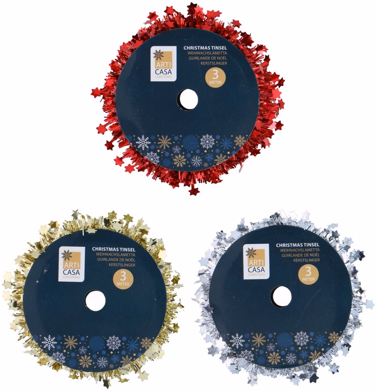 ARTICASA Xmas tinsel roll 3.5cmx3m 3as (8)/silver(8)/gold(8) -