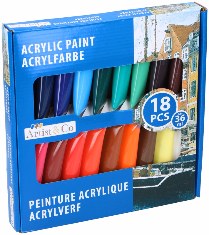 18 darabos akrilfesték készlet a köztünk lévő művészeknek. A készlet 18 tubusból áll, egyenként körülbelül 36 ml akrilfestékkel.