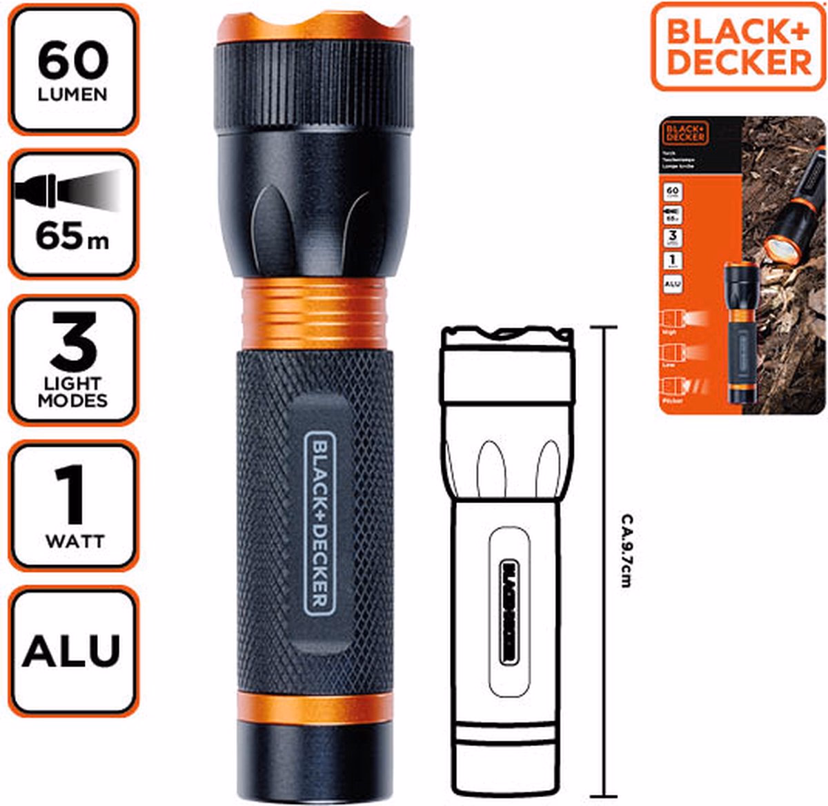 BLACK+DECKER Elemlámpa LED 60lmn 65m fénysugár 2,8*10,6cm 62gr