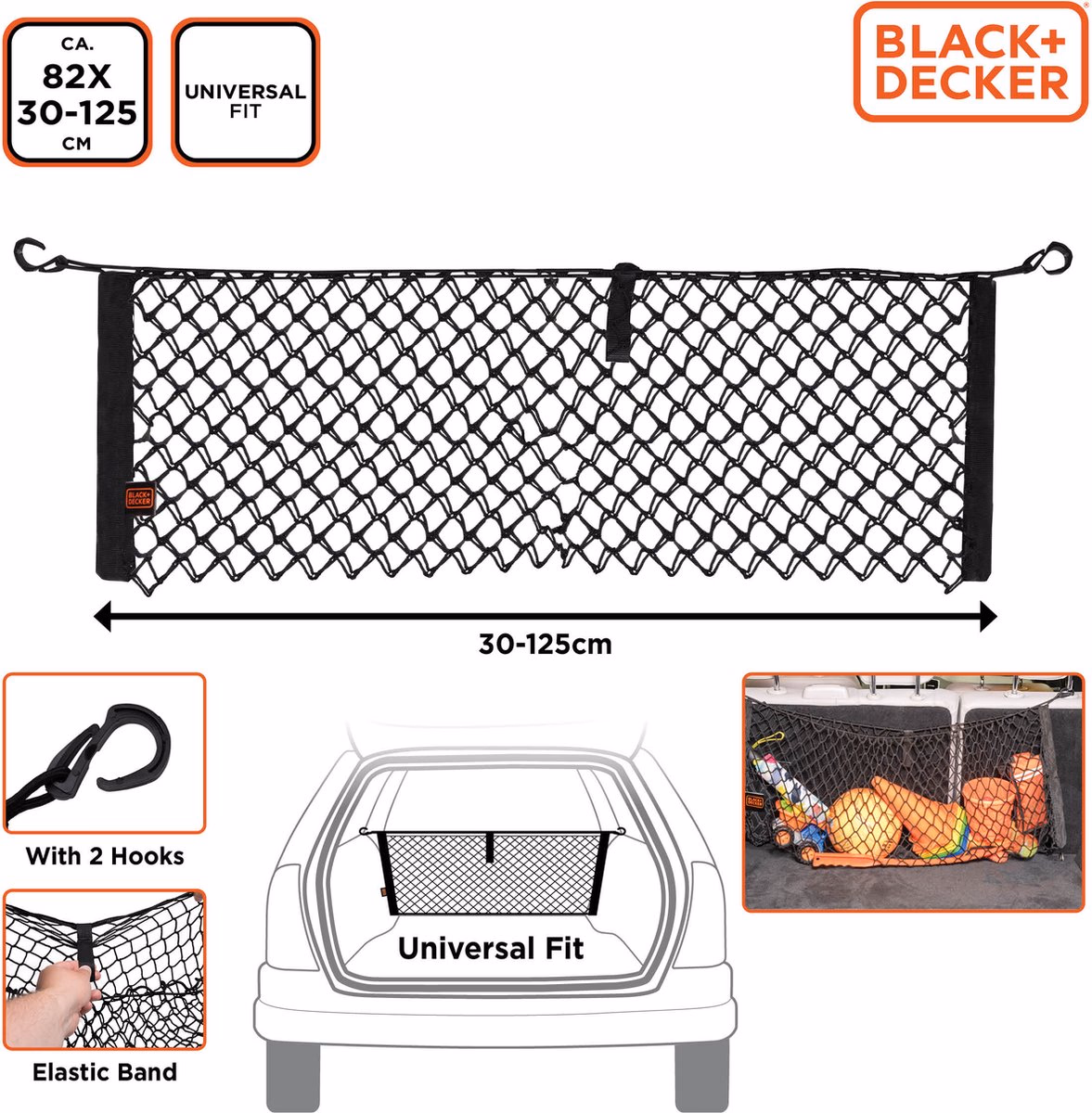 Gallery showing 5 images of BLACK+DECKER Rendszerező háló csomagtartóba 2 kampóval 125x30xcm 185gr