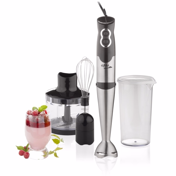 Botmixer 3 az 1-ben * Nagy teljesítményű és csendes DC motor 500 W teljesítmény felvétellel * Habverésre, dagasztásra és mixelésre alkalmas * Folyamatos fordulatszám szabályozás * Gomb I (szabályozott), II (magas) sebesség * Könnyű karbantartás * Akasztógyűrű * Tápkábel hossza 1,45 m Tartozékok: – botmixer rozsdamentes acélból – habverő tartozék – kis 0,8 l vágó tartozék (maximális feldolgozható mennyiség 0,4 l) – műanyag 600 ml munka edény fedéllel