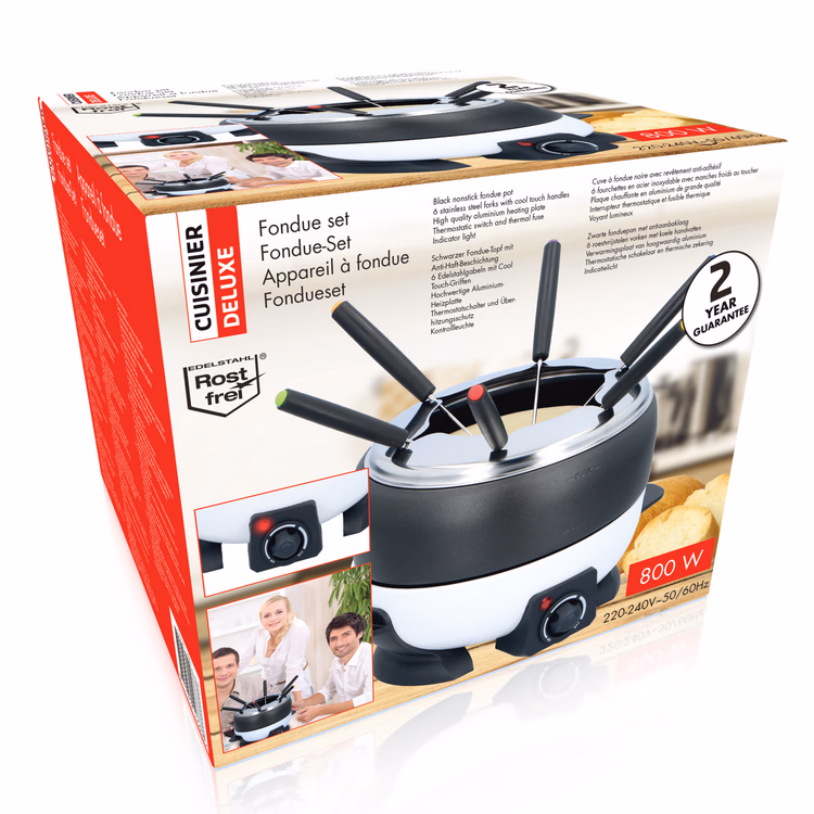A fondue edény rozsdamentes acélból készült, tapadásmentes bevonattal, ellenáll a magas hőmérsékletnek és jól vezeti a hőt. A tetején egy bevágásokkal ellátott gallér található, ahol a fondüvillákat pihentetheti és fröccsenésgátlóként is funkcionál. A csomagban hat fondü villa található.