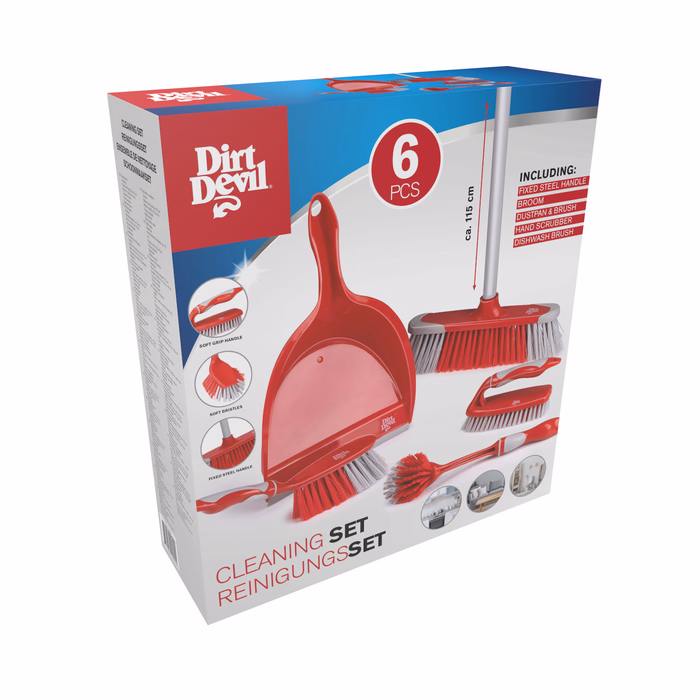 DIRT DEVIL tisztítókészlet 6 részes - Mosogatókefe / Kézi súroló / Puha seprű nyéllel / Szemközti kefével és kefével - Piros / Szürke