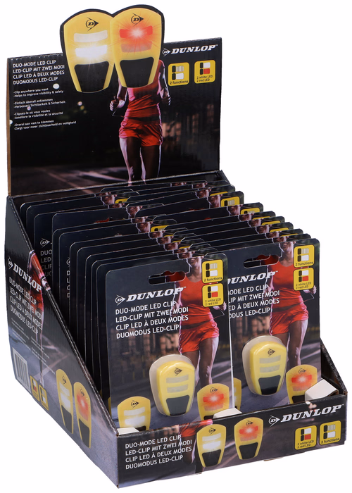 Legyen jól látható sportolás közben a Dunlop Sport Led Clip segítségével. Ez a klip fehér és piros fényt ad, és állítható.