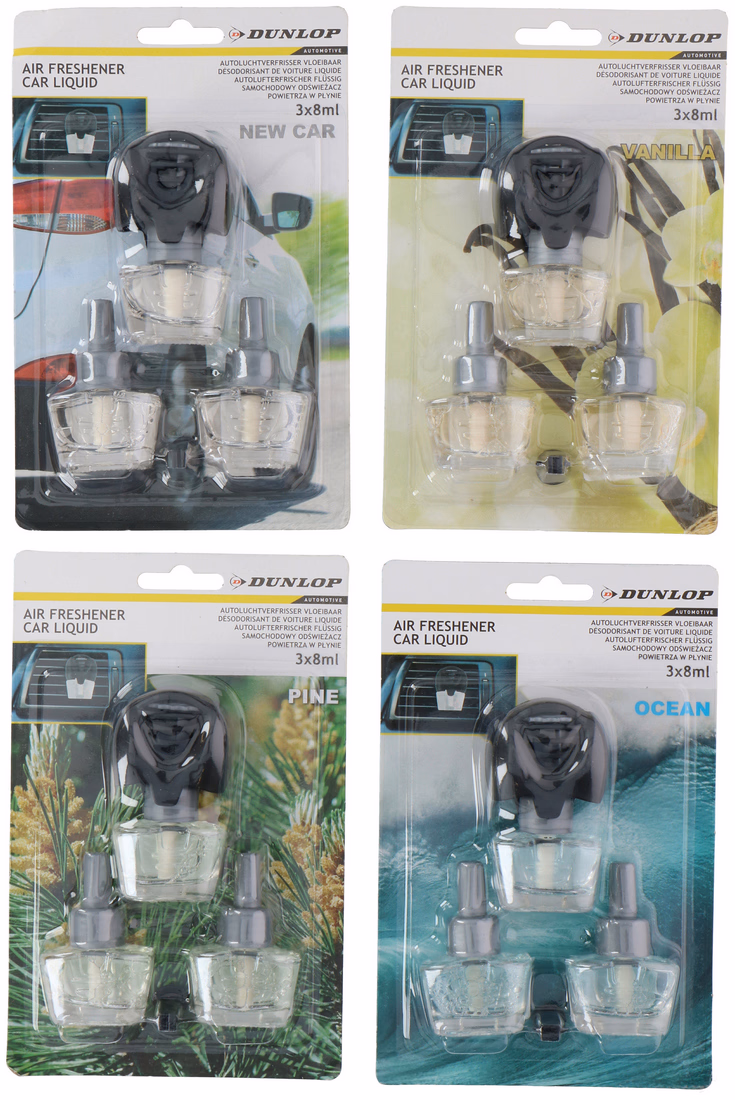 DUNLOP Illatosító tartályos 3x8ml, 4 illatban (Vanilia, Fenyő, Óceán, Új autó)