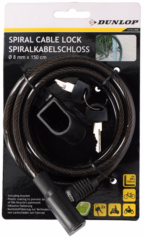 DUNLOP kerékpár kábelzár, 8mm x 150 cm, 2 kulcs, vázra rögzíthető