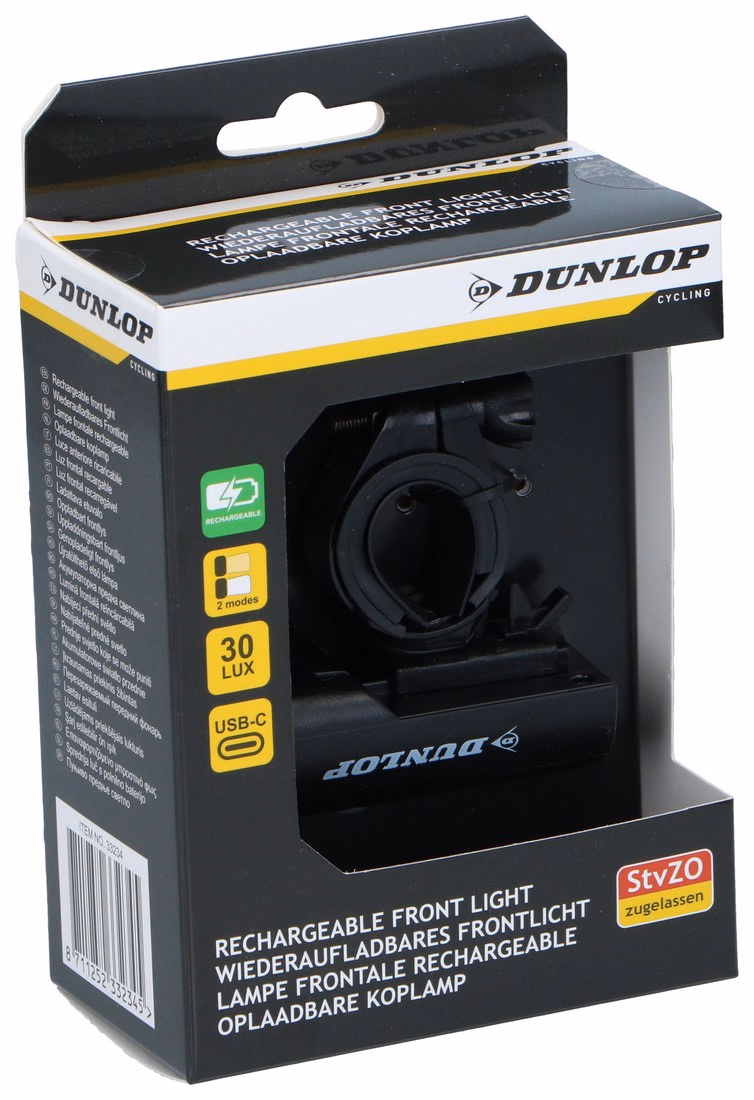 DUNLOP Kerékpár lámpa első K-mark, tölthető, USB-C, 30 lux, 2 fokozat