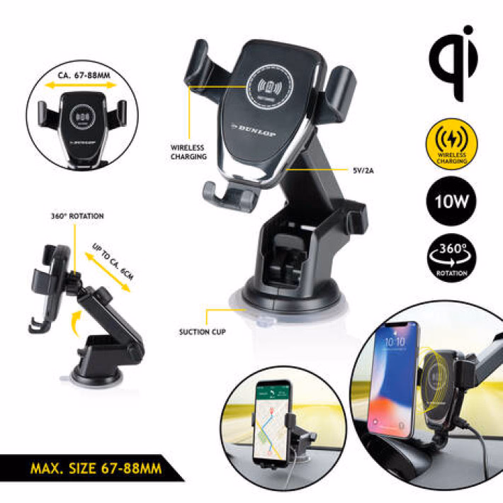DUNLOP telefontartó vezeték nélküli töltéssel - 10 W - Qi technológia - fekete