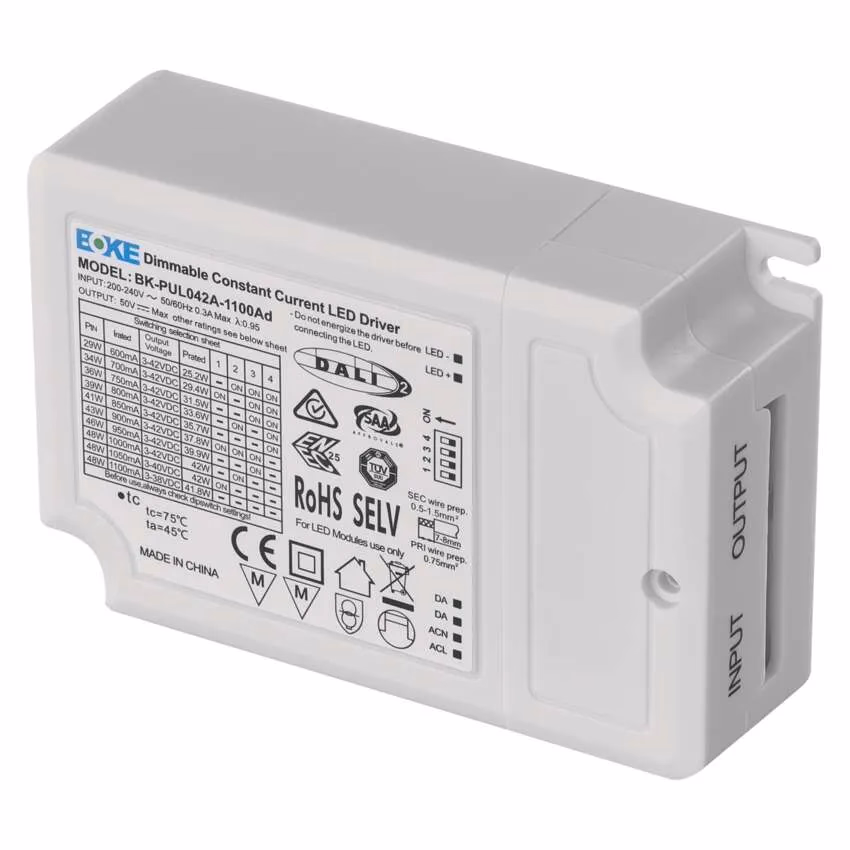 bemeneti feszültség: 200–240 V AC, frekvencia: 50/60 Hz, kimeneti feszültség: 6–42 V DC, kimeneti áram: 450–1 100 mA, fogyasztás: 40 W, méretek: 103 × 68 × 30 mm, teljesítménytényező: > 0,9, védettség: IP20, típus: DALI 2.0, PUSH DIM, energiaosztály: A, garancia-időszak: 5 év