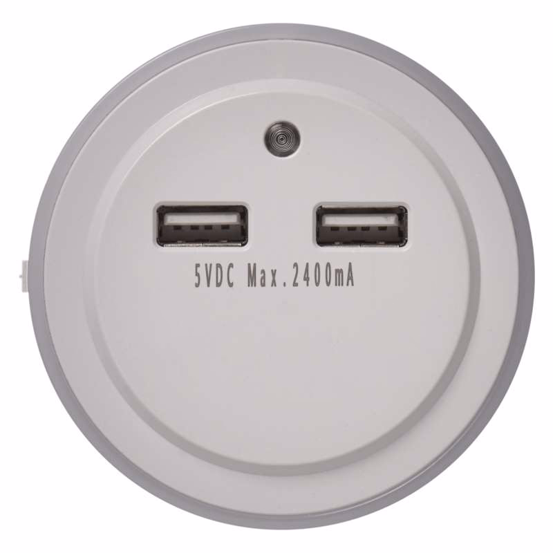 Praktikus, aljzatra szerelt LED-es éjszakai lámpa fényérzékelővel. Kiváló megoldás, ha vészvilágításra vagy annál többre van szükség. 2 db USB-csatlakozójáról különféle készülékeket láthat el árammal.