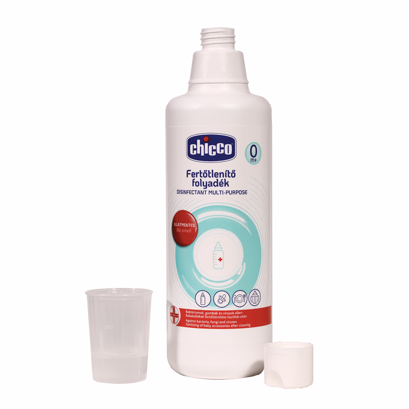 Magas tisztaságú Chicco fertőtlenítő folyadék, mely hatásos a baktériumok, gombák és vírusok ellen.