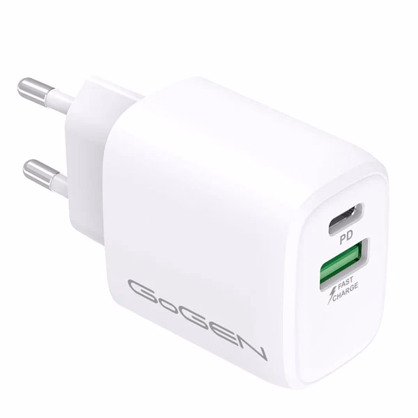 GoGEN hálózati töltő, 1x USB-C PD 20W, 1x USB-A 18W, 3A, 5V/9V/12V, fehér