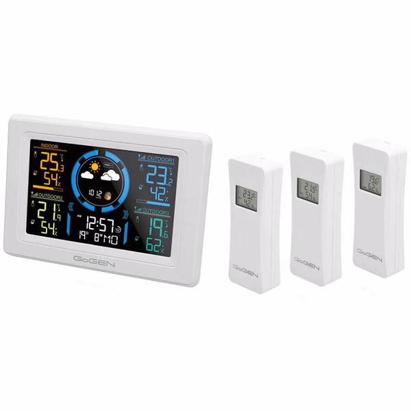 GoGEN Időjárásállomás, színes LCD kijelző, 3 vezeték nélküli érzékelő, fehér színben