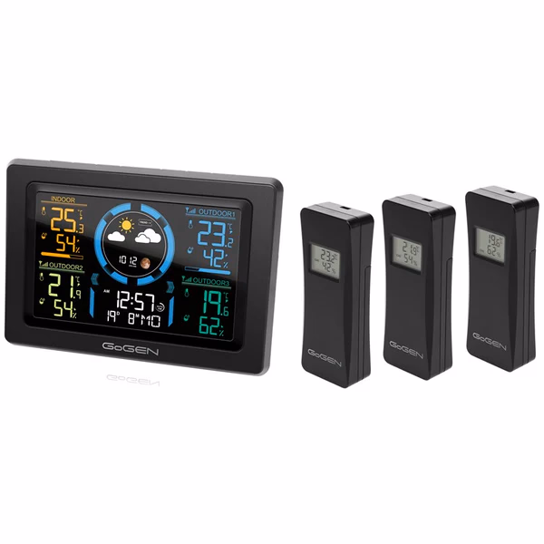 GoGEN Időjárásállomás, színes LCD kijelző, 3 vezeték nélküli érzékelő, fekete színben
