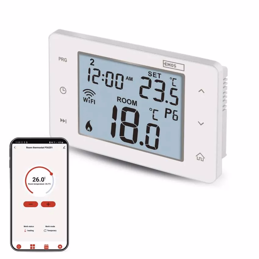 Az EMOS GoSmart sorozat P56201 intelligens termosztátjával ez egyszerűen lehetséges. A fűtés vagy légkondicionálás az Ön GPS-helyzete alapján történő vezérlése, hőmérsékleti ütemezés beállítása egy adott napra és időpontra, valamint a készülék egy alkalmazás segítségével bárhonnan történő vezérlése csak egy rövid lista a termosztát fejlett funkcióiról.