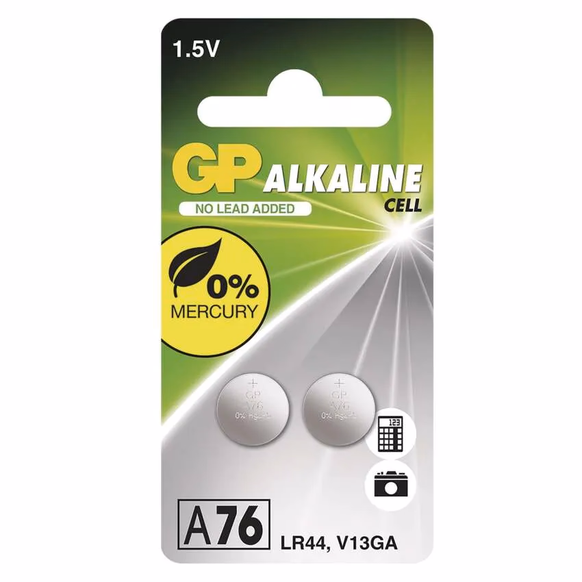 kémiai összetétel: alkáli, kategória/sorozat: Alkaline cell, típus: GP A76F (AG13, LR44, LR1154, V13GA, PX76A), feszültség: 1,5 V, tölthető: nem, kapacitás: 110 mAh (1,6 kohm-os terhelés esetén), méretek: 11,6 × 5,4 mm, súly: 1,7 g, üzemi hőmérséklet: 0 °C és +45 °C, max. tárolási idő: 3 év, mennyiség szerinti ár: 1 db ára, értékesítési csomagolás: 2 db, bliszter, garancia-időszak: 2 év