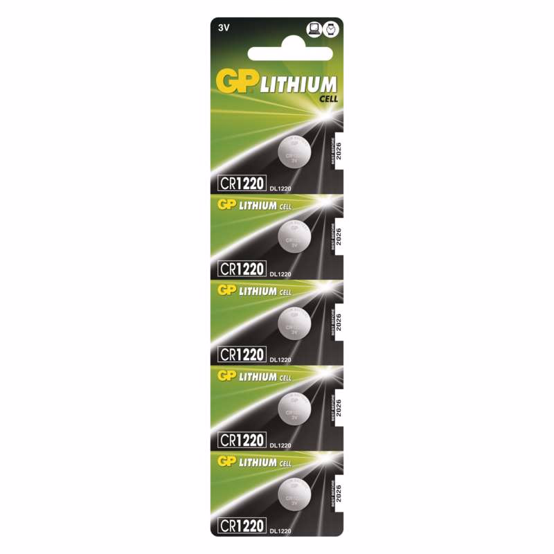 kémiai összetétel: lítium, kategória/sorozat: Lithium, típus: GP CR1220, feszültség: 3 V, tölthető: nem, kapacitás: 36 mAh (30 kohm-os terhelés esetén), méretek: 12,5 × 2,0 mm, súly: 0,8 g, üzemi hőmérséklet: -20 °C és +60 °C, max. tárolási idő: 10 év, mennyiség szerinti ár: 1 db ára, értékesítési csomagolás: 5 db, bliszter, garancia-időszak: 2 év