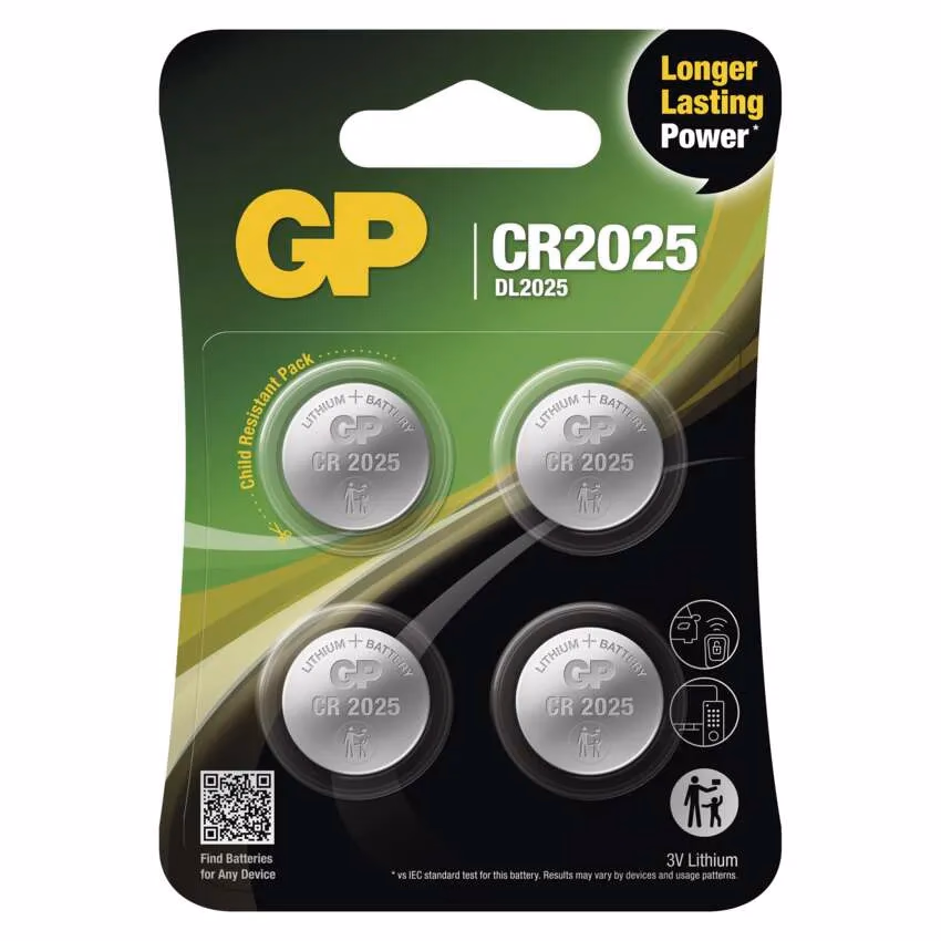 kémiai összetétel: lítium, kategória/sorozat: Lithium, típus: GP CR2025, feszültség: 3 V, tölthető: nem, kapacitás: 165 mAh, méretek: 20,0 × 2,5 mm, súly: 2,5 g, üzemi hőmérséklet: -20 °C és +60 °C, max. tárolási idő: 10 év, mennyiség szerinti ár: 1 db ára, értékesítési csomagolás: 4 db, bliszter, garancia-időszak: 2 év