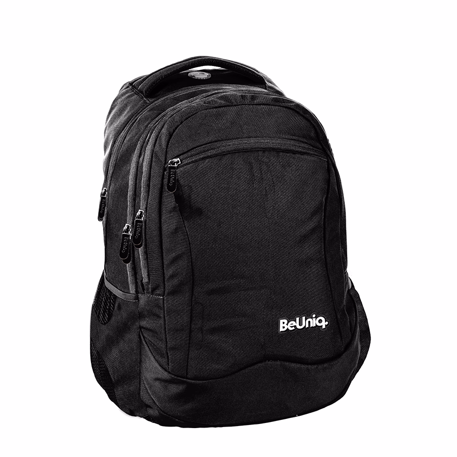 Backpack, three compartments, one front pocket, two side mesh/fabric pockets, internal organizer, regulated shoulder straps,upper handle with pattern, reflective elements, padded molded back, padded bottom, media pocket with headphone port, water repellent fabric, beuniq lining.