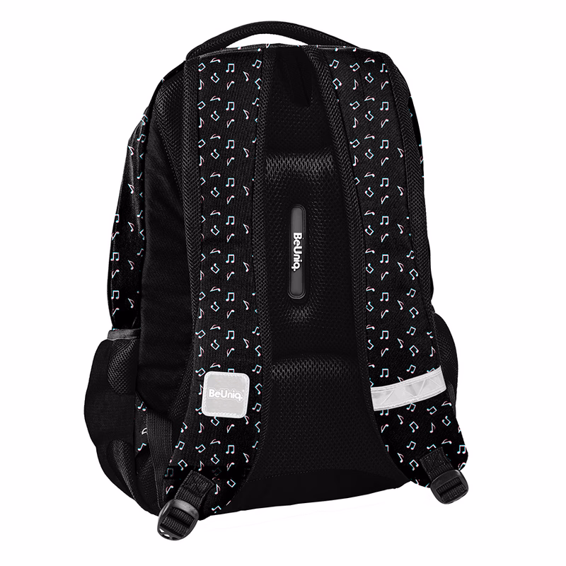 Egyszínű, fekete hátizsák, melyet apró, fehér hangjegyek díszítenek.