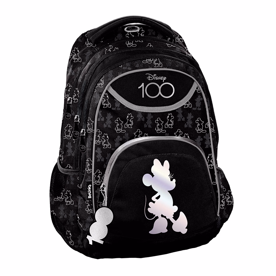 Fekete és ezüst kivitelezésű holografikus Minnie egeres mintával dekorált hátizsák.