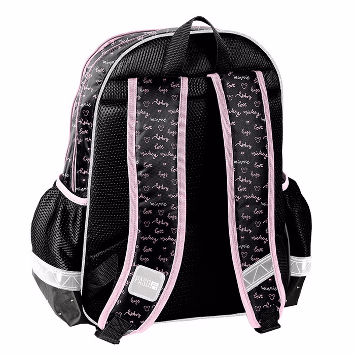 Divatos Minnie Mouse feliratos fekete, rózsaszín szinvilágú hátizsák.