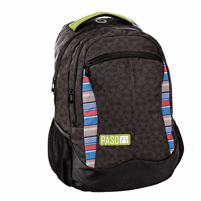 Backpack, two compartments, one front pocket, two side mesh pockets, internal organizer, regulated shoulder straps, reflective elements, padded molded back, padded bottom, media pocket with headphone port, water repellent fabric