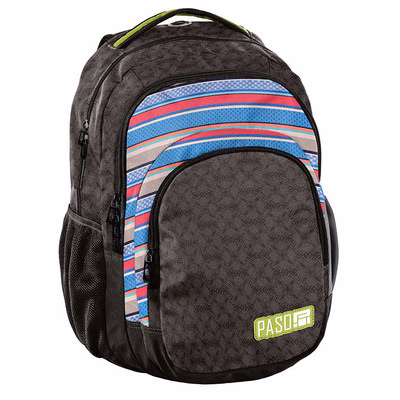 Backpack, two compartments, one front pocket, two side mesh pockets, internal organizer, regulated shoulder straps, reflective elements, very stiff back covered with EVA foam, padded bottom, media pocket with headphone port, water repellent fabric