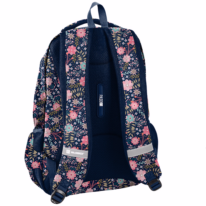 Backpack, three compartments, one front pocket, two side mesh/fabric pockets, internal organizer, regulated shoulder straps,upper handle with pattern, reflective elements, padded molded back, padded bottom, media pocket with headphone port, water repellent fabric