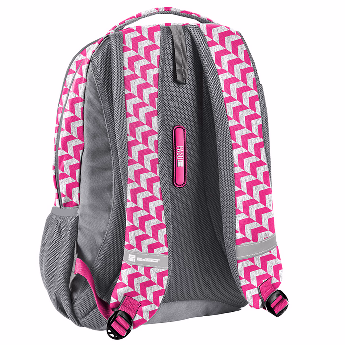 Backpack, three compartments, one front pocket, two side mesh pockets, internal organizer, regulated shoulder straps, reflective elements, padded molded back, padded bottom, media pocket with headphone port, water repellent fabric
