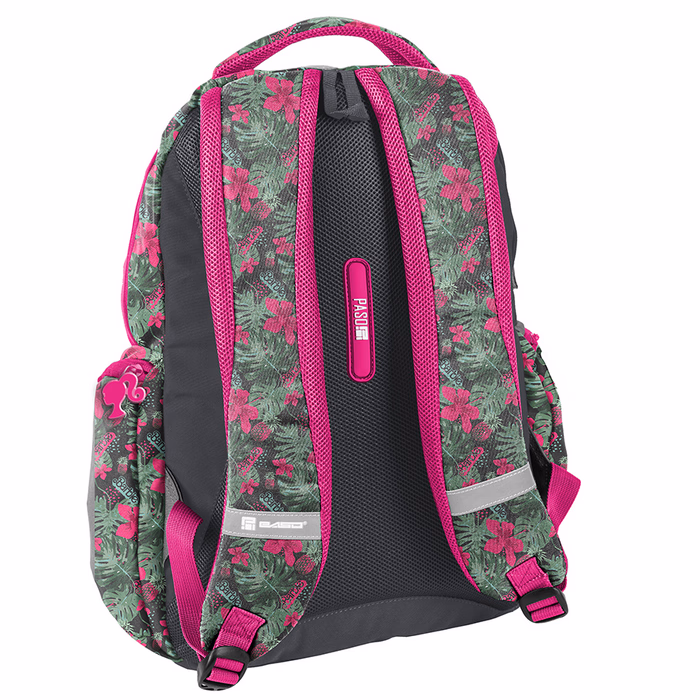Backpack, three compartments, one front pocket, two side mesh pockets, internal organizer, regulated shoulder straps, reflective elements, padded molded back, padded bottom, media pocket with headphone port, water repellent fabric