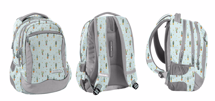 Backpack, three compartments, one front pocket, two side mesh/fabric pockets, internal organizer, regulated shoulder straps,upper handle with pattern, reflective elements, padded molded back, padded bottom, media pocket with headphone port, water repellent fabric