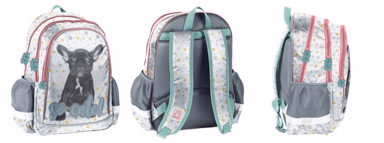 Backpack, two compartments, one front pocket, side mesh pockets, stiff ergonomic back covered with mesh, profiled shoulder straps with mesh, reflective element,holographic label & glitter piping.