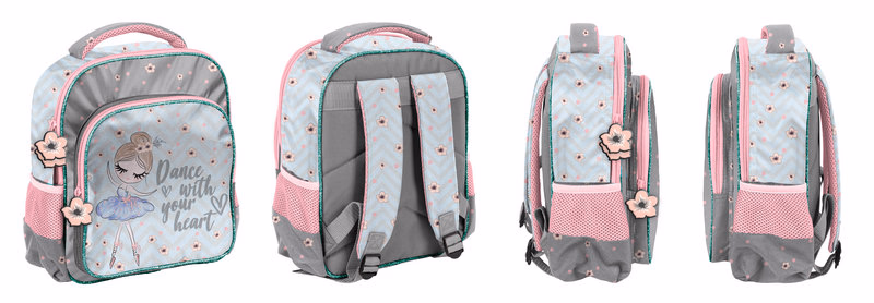 Backpack, one compartment, one front pocket, side mesh pockets, stiff back, profiled shoulder straps, weight - only 490g; print with selective glitter.