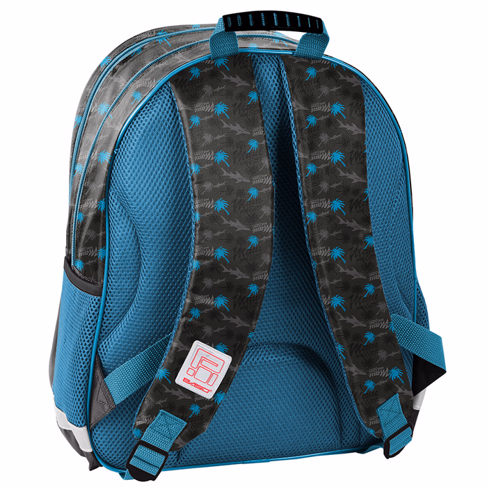 Backpack, two compartments, one front pocket, side mesh pockets, profiled shoulder straps with mesh, stiff back covered with mesh, reflective elements