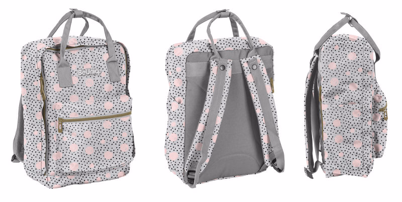 Szürke táska fekete és rózsaszín pöttyökkel díszítve. A hátizsák kényelmes vállpántokkal van ellátva, melyek állíthatóak a megfelelő illeszkedés érdekében. A táska egy nagy, cipzáras rekeszből és egy kisebb rekeszből áll. A hordozhatóságot tovább fokozza a táska kényelmes hordozó fogantyúja. Az érdekes pöttyös minta pedig szemet gyönyörködtető megjelenést kölcsönöz a hátizsáknak. Méretei: 37 x 27 x 14 cm