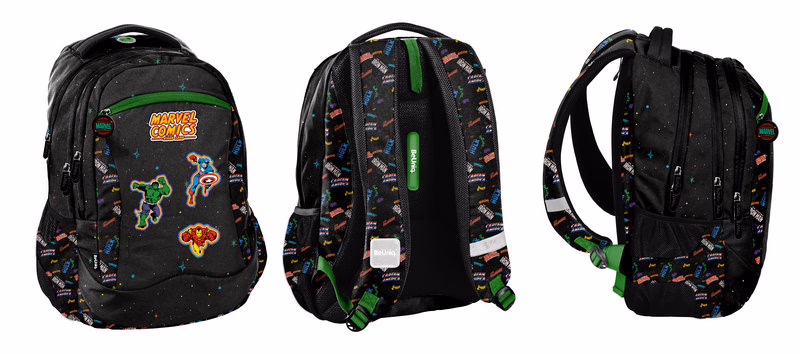 Backpack, three compartments, one front pocket, two side mesh/fabric pockets, internal organizer, regulated shoulder straps,upper handle with pattern, reflective elements, padded molded back, padded bottom, media pocket with headphone port, water repellent fabric, marvel lining.